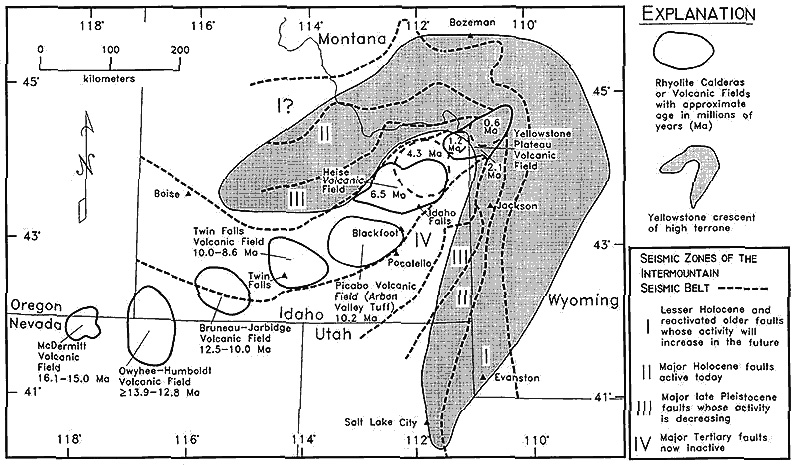 (Left/Above) Four zones of seismic activity are associated with the migration of the hotspot (Figure 4 after Pierce and Morgan, 1992). Zone II contains active Holocene faults that are thought to be connected with current volcanic activity of the Yellowstone Hotspot. Zone III contains late Pleistocene faults that are decreasing in activity. Zone IV contains faults that are no longer active. The zones form belts that curve around the hotspot track.