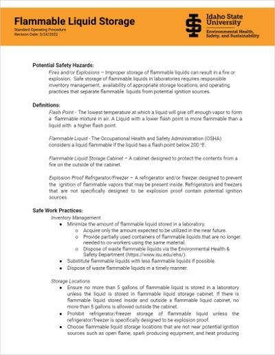 ISU maintains an expanding list of SOPs related to hazardous material handling and the performance of some hazardous activities. If you need assistance finding or developing an SOP please contact EHSS at 208-282-2310.