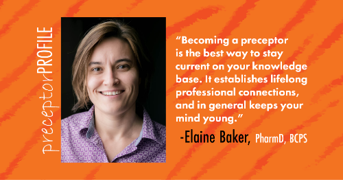 As a student, her positive experiences with preceptors ultimately led to Baker’s decision to become a preceptor herself. Prior to going to pharmacy school, she was a college basketball coach and has always enjoyed being involved in teaching and mentoring. Baker says her interactions with students keeps her young and she believes she has one of the greatest jobs in pharmacy.