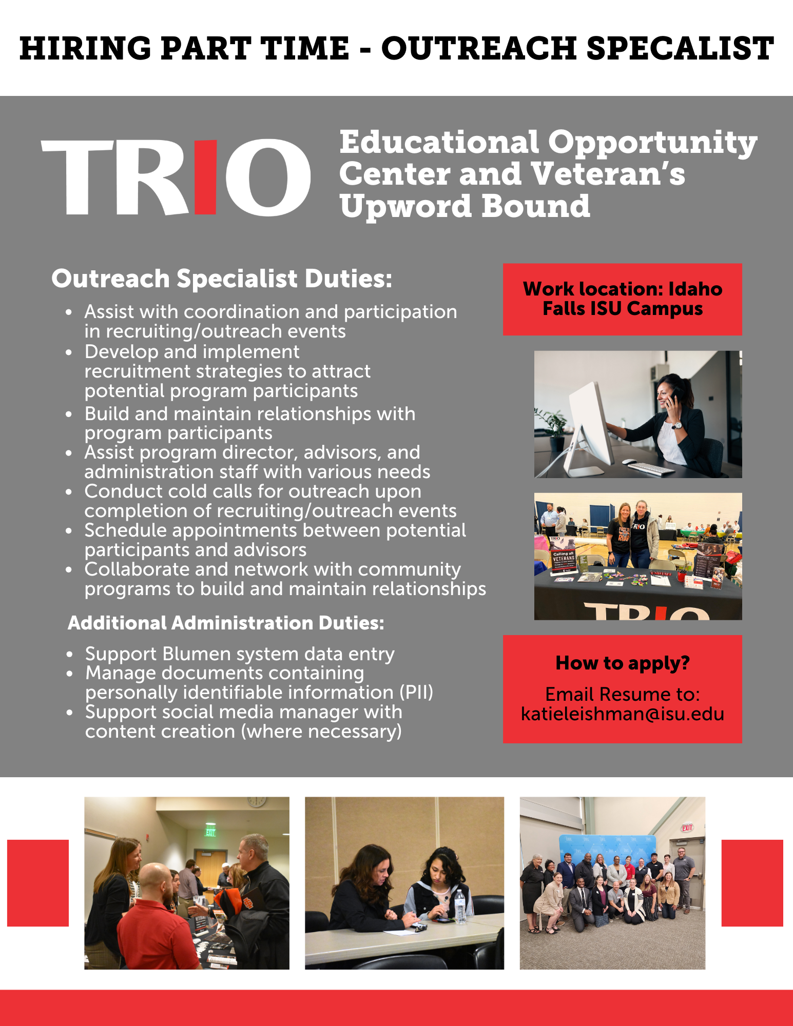 The TRIO Educational Opportunity Center and Veterans’ Upward Bound Program at Idaho State University, Idaho Falls, seeks a part-time Outreach Specialist to assist with recruitment efforts, participant engagement, and administrative support. This is a fantastic opportunity for individuals passionate about education access and community involvement.