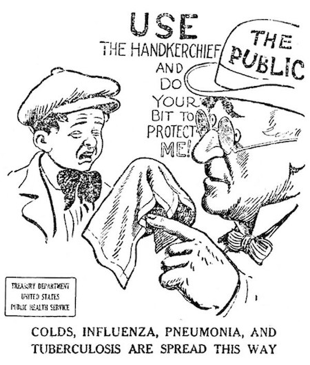 Lower image information: "Cover Your Cough" image that appeared in the Paris (Idaho) Post on Dec. 13, 1918 that ran with a story titled "U.S. Health Service Issues Warning."