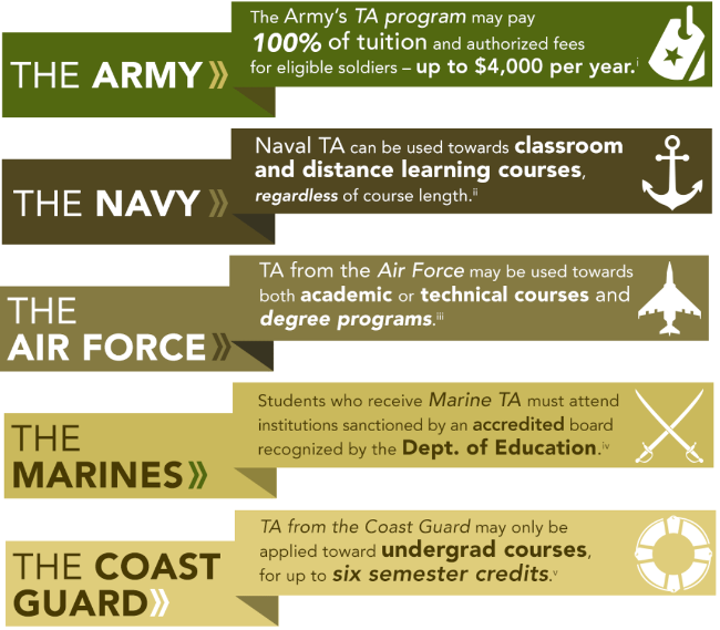 A: All branches cover $250/semester credit or $166/quarter hour, and up to $4,000 Fiscal year (October 1-September 30). TA will not cover fees such as books, course materials, taking the same course twice, or continuing education credits.